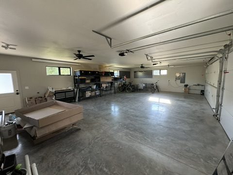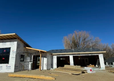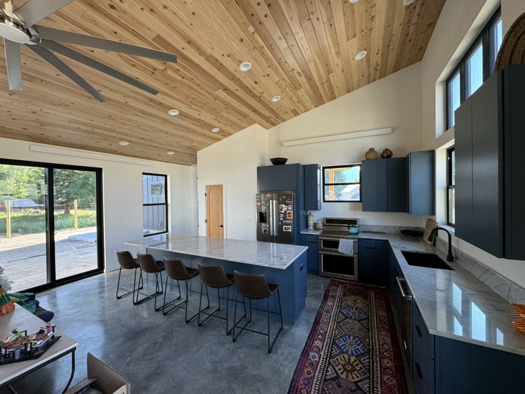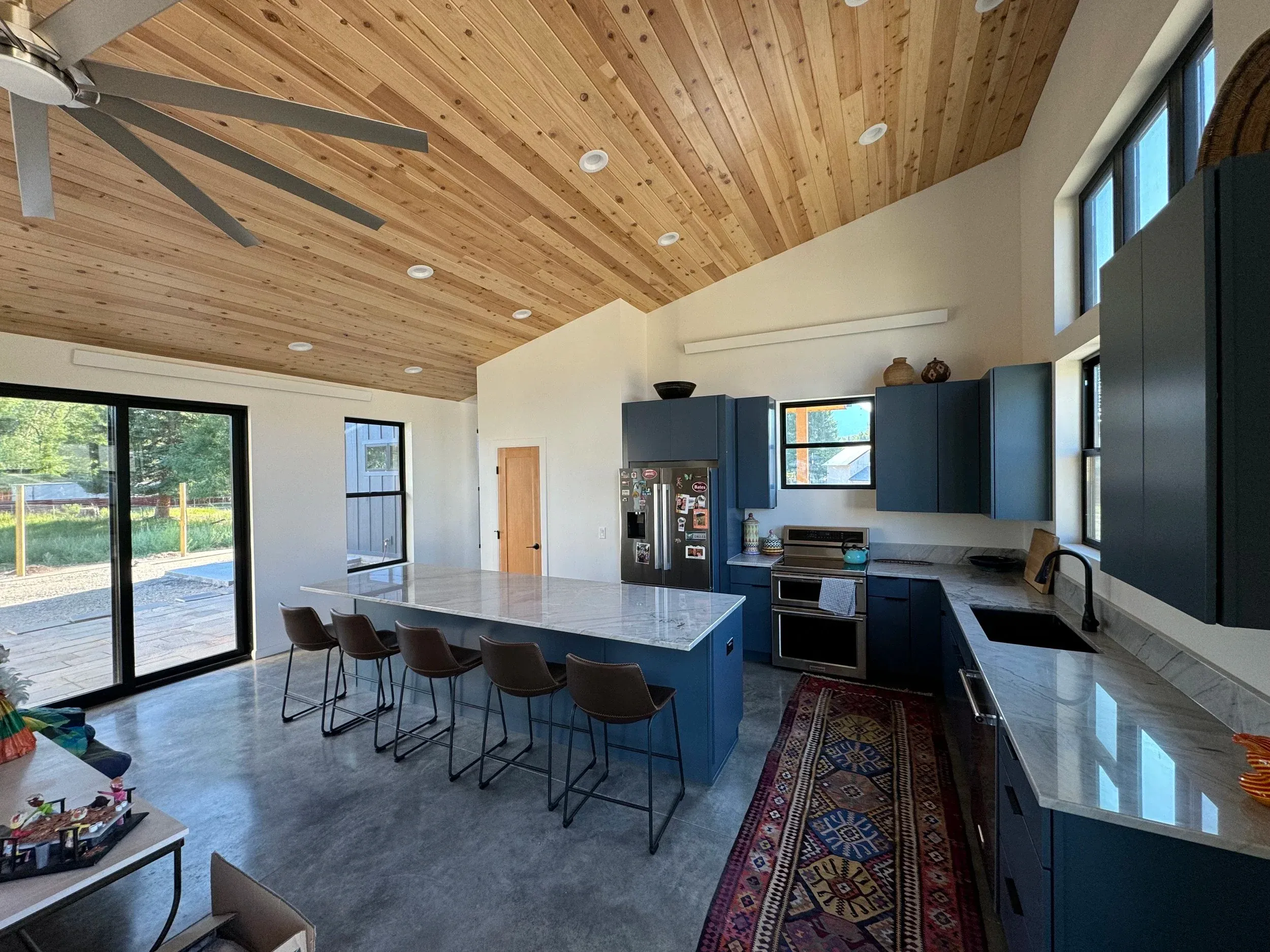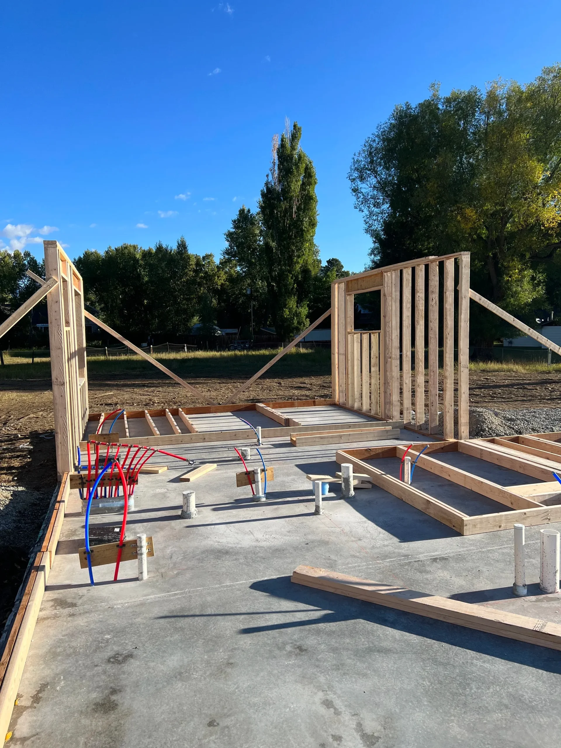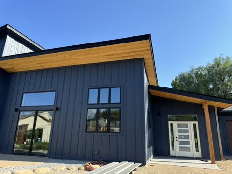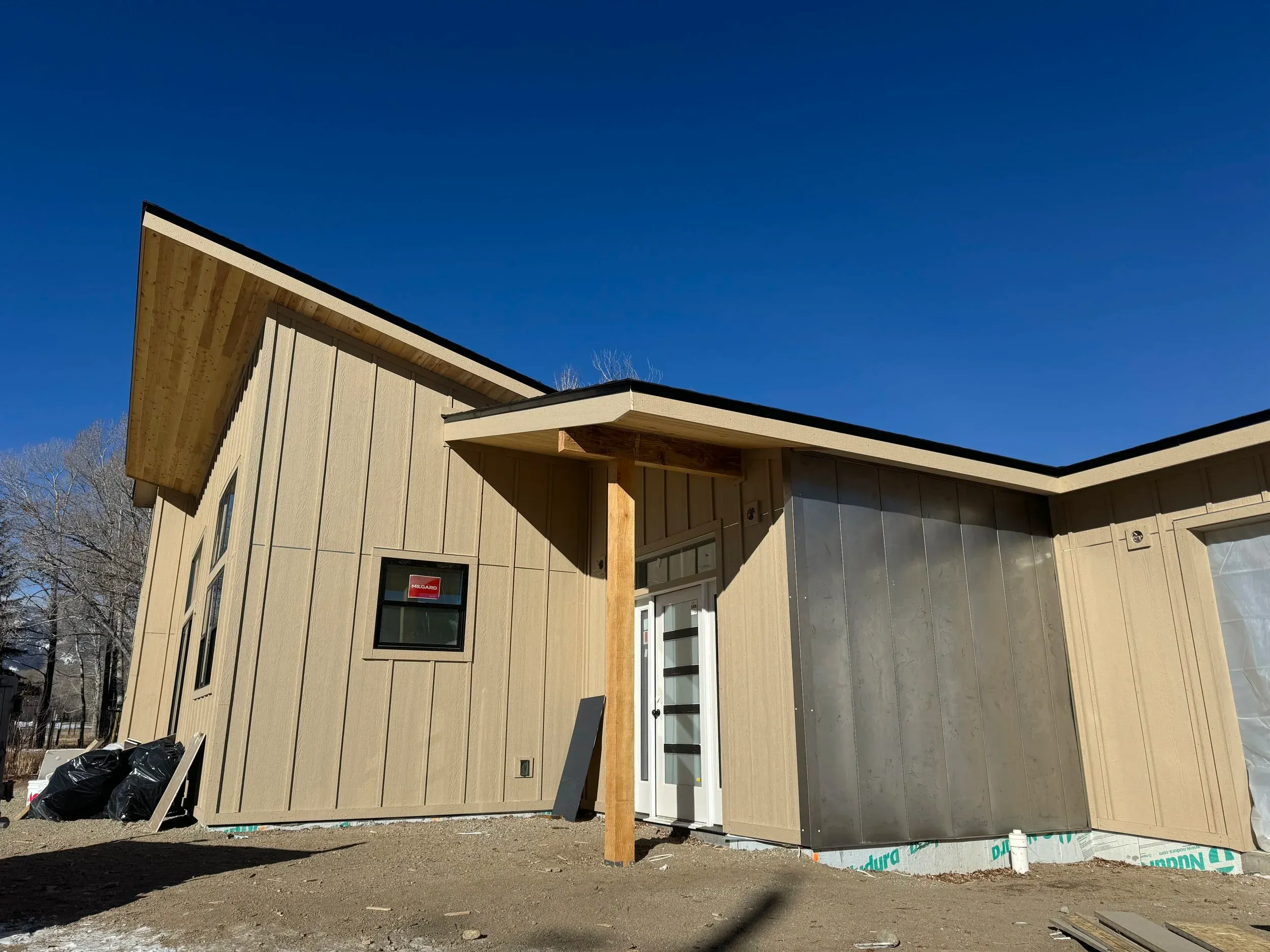 This new home is a slab-on-grade 3-bed, 3.5-bath house featuring a walk-in shower in every full bathroom, vaulted shed-style ceilings to maximize mountain views, a large three-car garage, and solar panels.