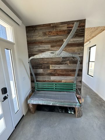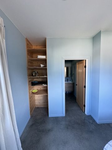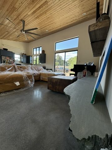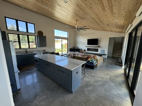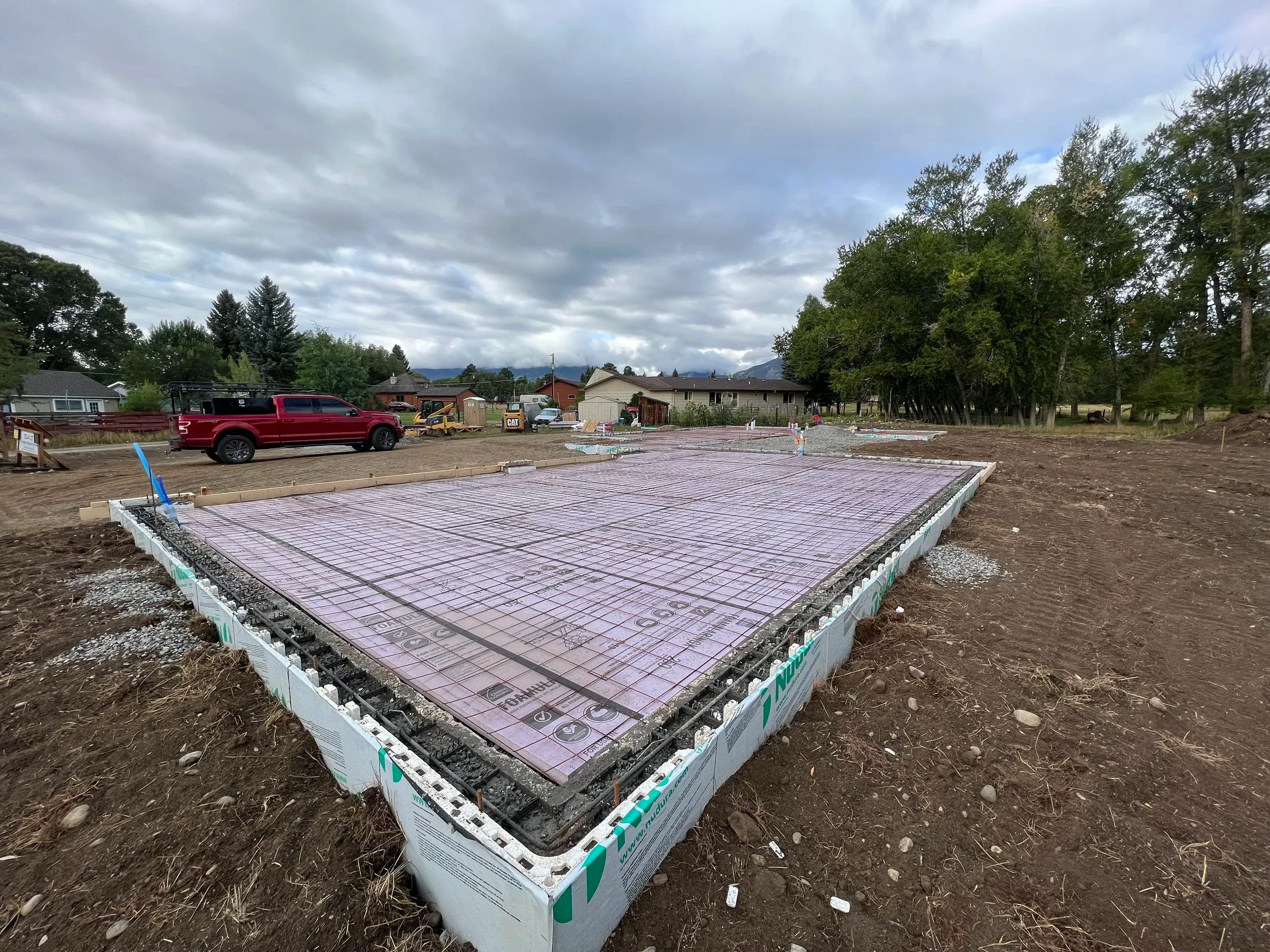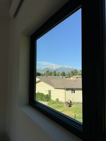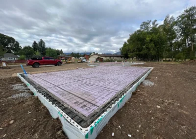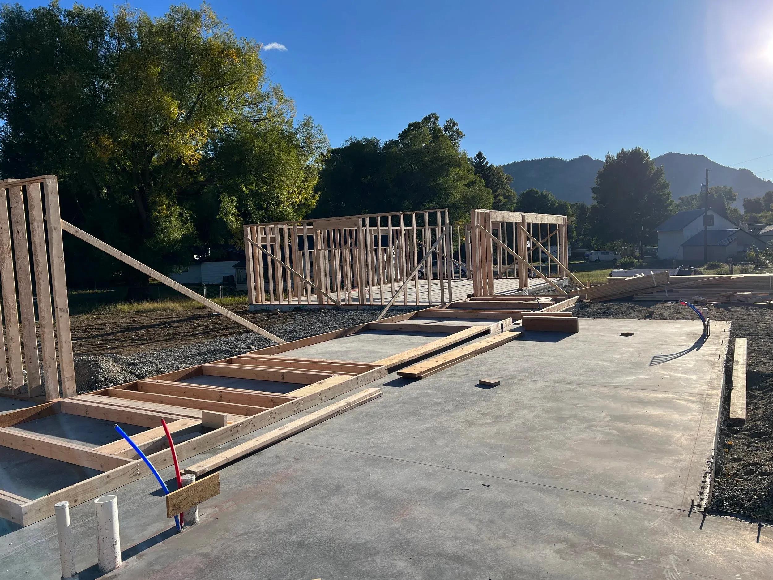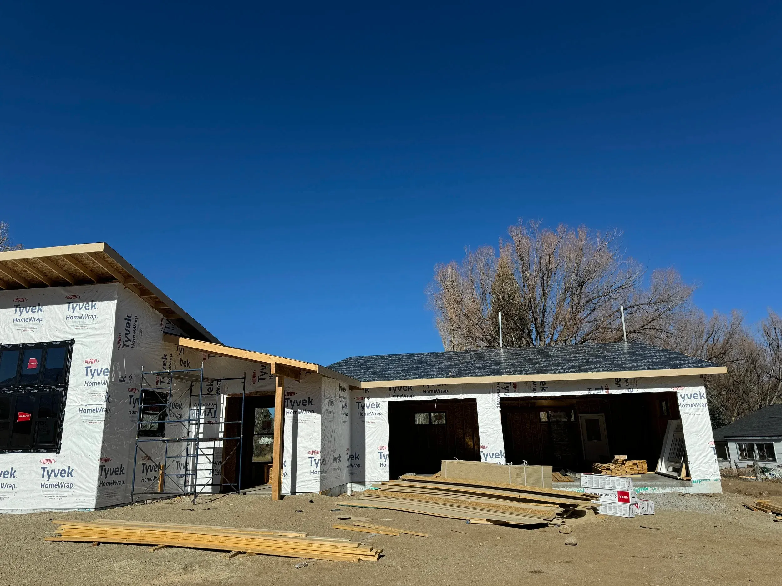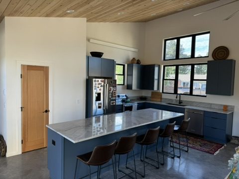 This new home is a slab-on-grade 3-bed, 3.5-bath house featuring a walk-in shower in every full bathroom, vaulted shed-style ceilings to maximize mountain views, a large three-car garage, and solar panels.