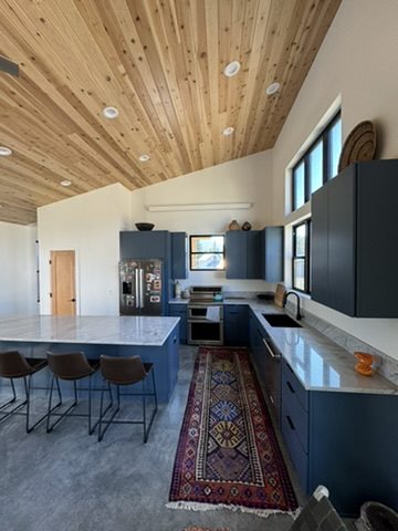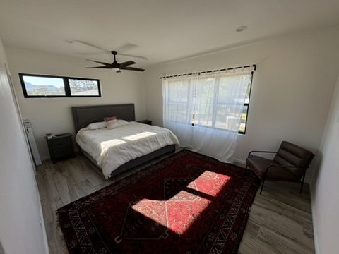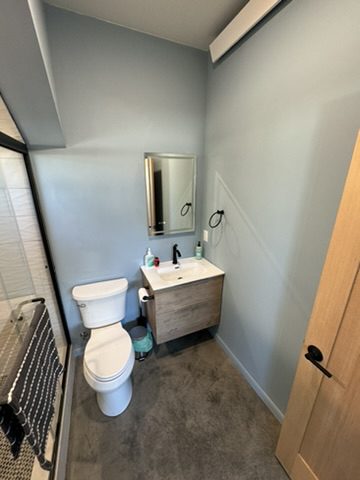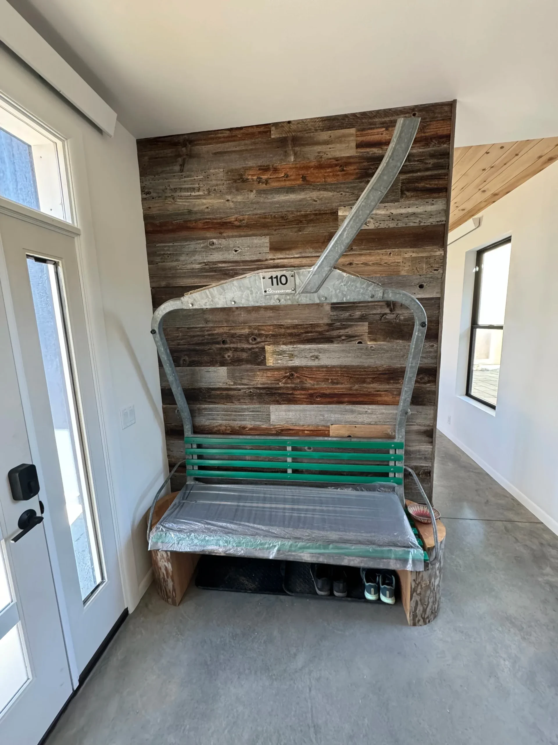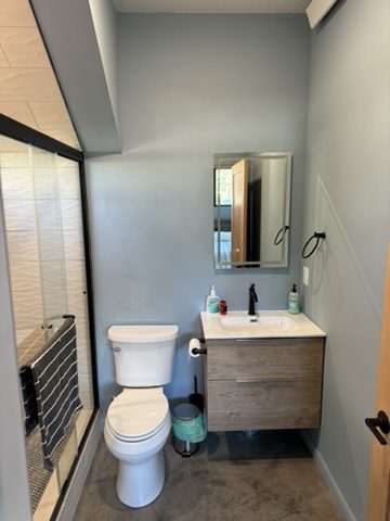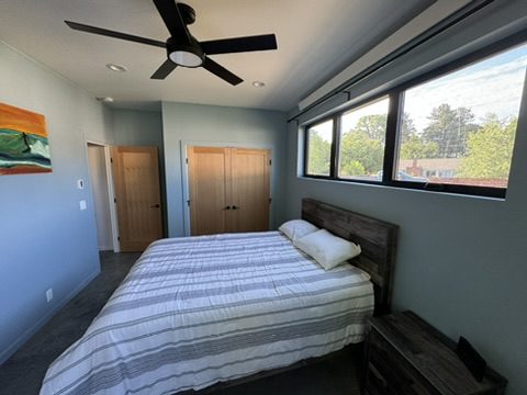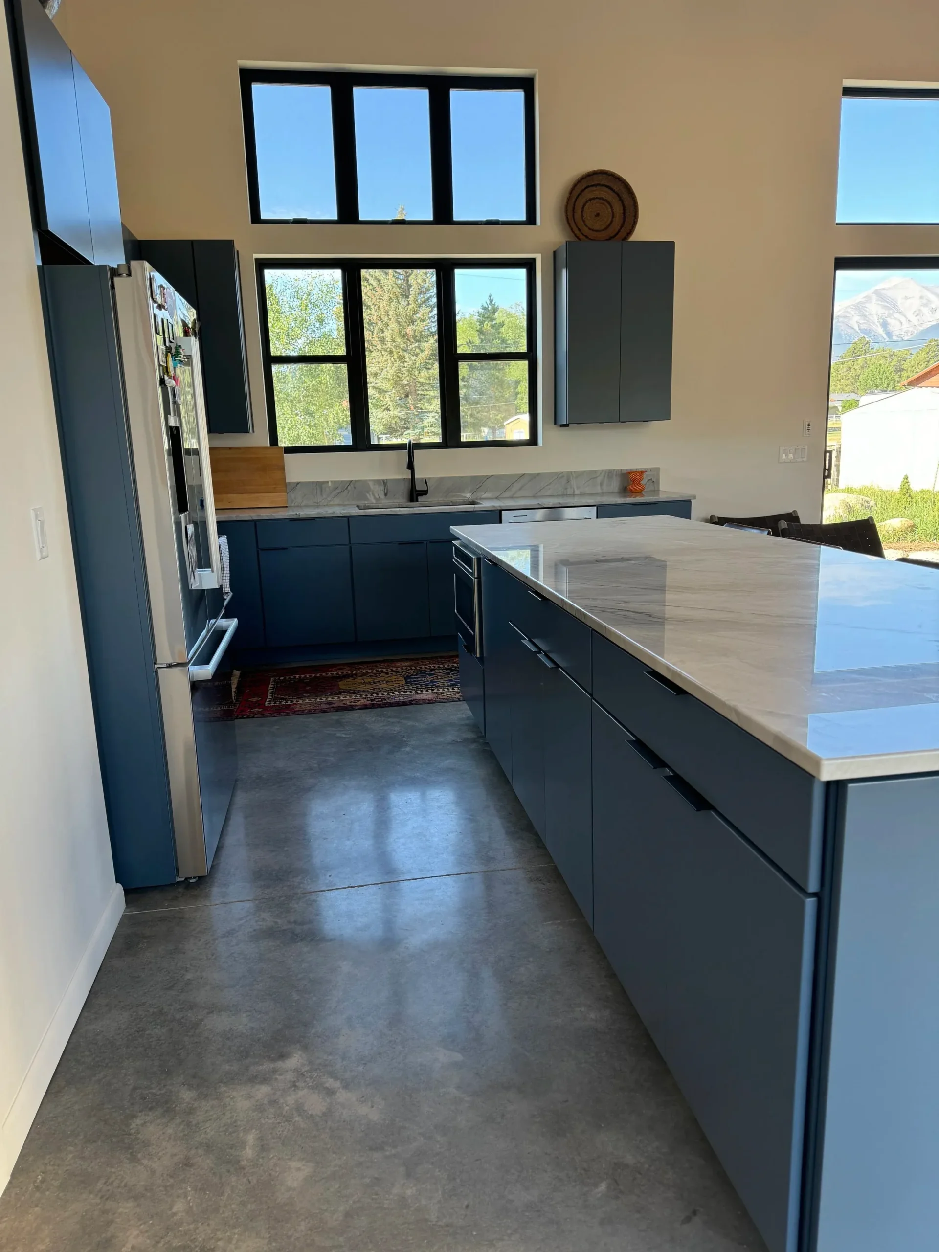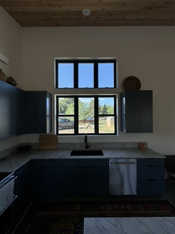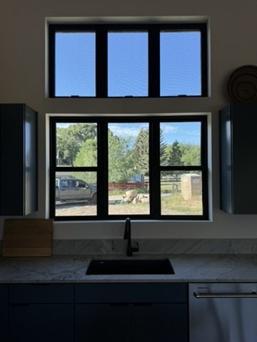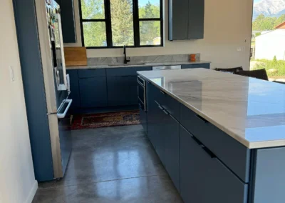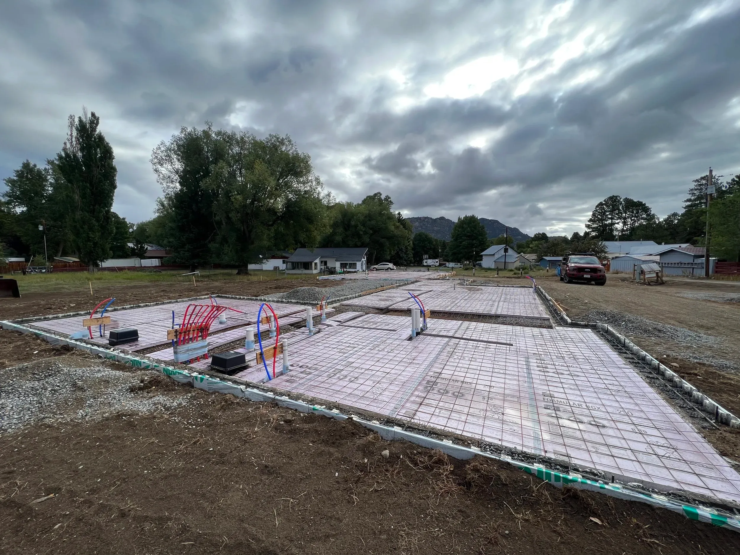 This new home is a slab-on-grade 3-bed, 3.5-bath house featuring a walk-in shower in every full bathroom, vaulted shed-style ceilings to maximize mountain views, a large three-car garage, and solar panels.